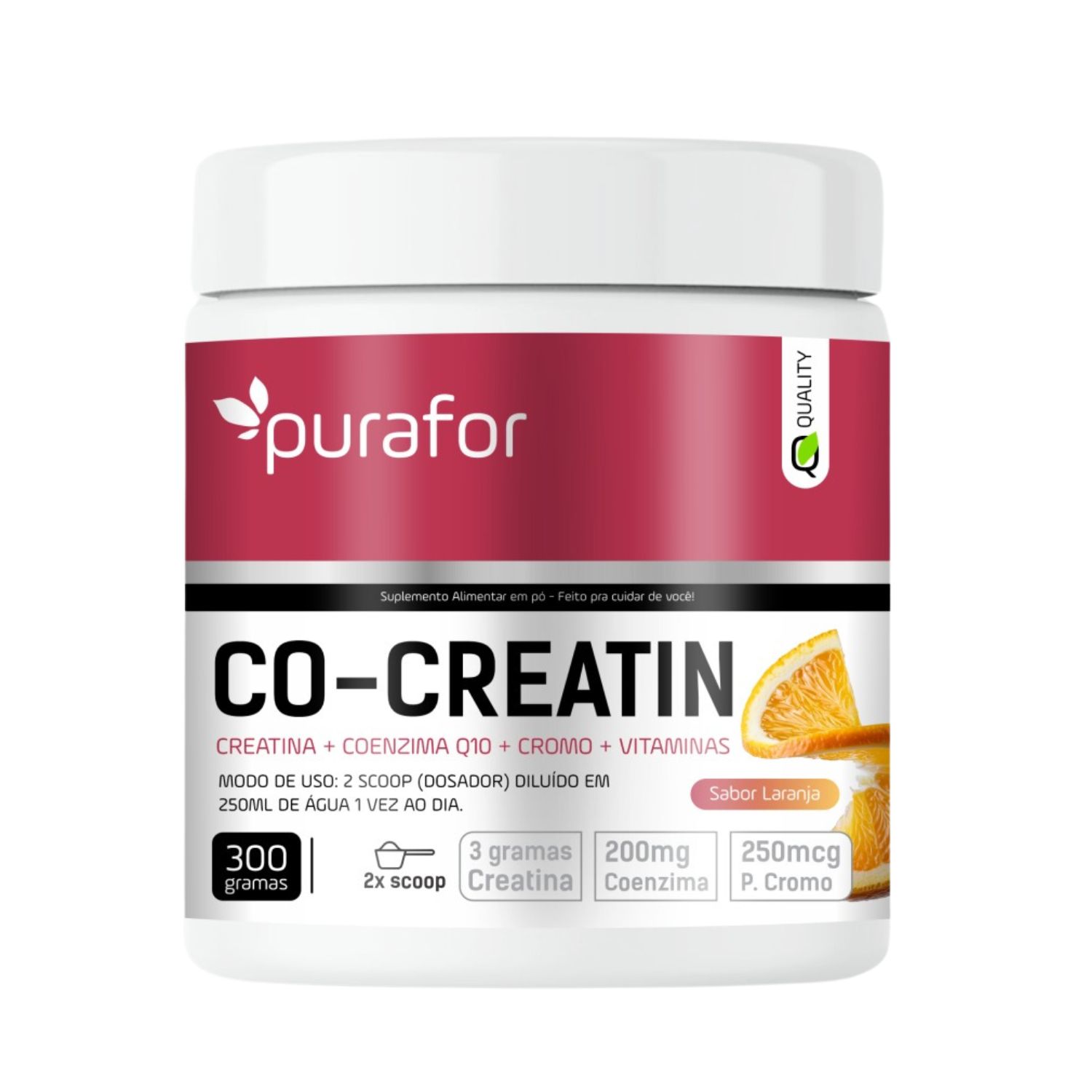 Creatina Purafor com CoQ10, Cromo e Vitaminas. Energia, força e desempenho com sabor laranja.